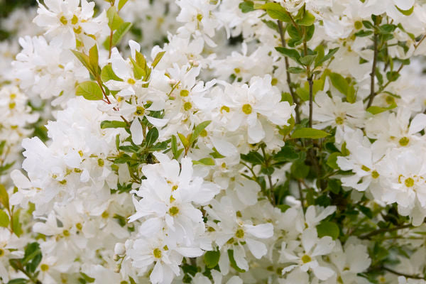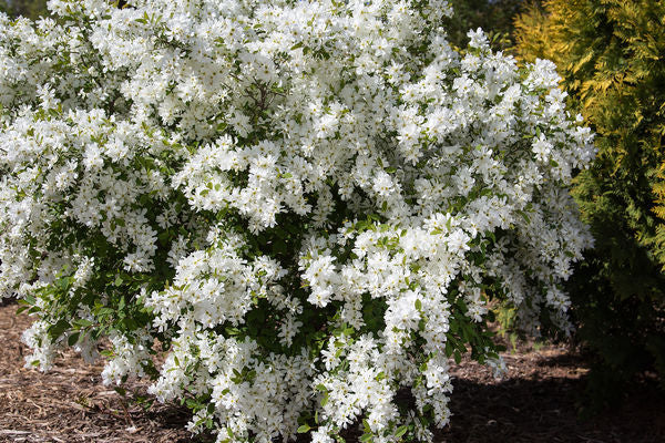 This spring bloomer is covered in white round flower buds resembling a string of pearls. Buds open to clear white blooms that completely cover the plant in April and May, attracting butterflies. Lotus Moon™ has bright green foliage on compact, upright, mounded plants. Deer resistant and low maintenance, a great addition to any landscape.